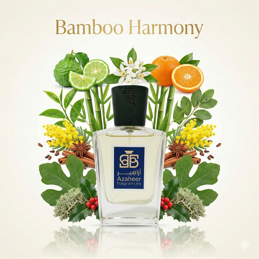 Bamboo Harmony at Azaheer Fragrances: bergamot & neroli, white tea and mimosa, with fig leaf and oakmoss for a calm green finish.