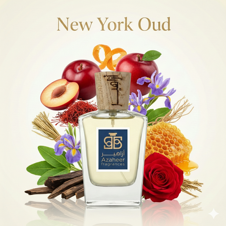 New York Oud at Azaheer Fragrances: red plum, saffron & orange zest over rose-oud with orris and patchouli—finished with musk, honey and vetiver.