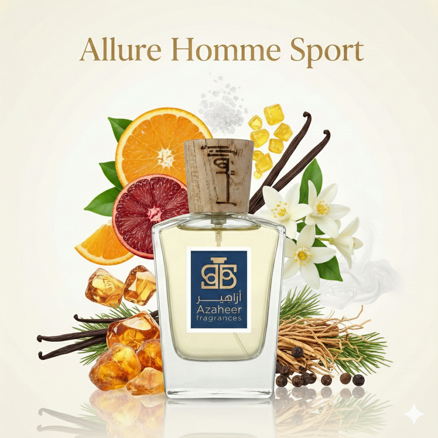 Allure Homme Sport at Azaheer Fragrances: orange, sea notes & aldehydes with blood mandarin—pepper/neroli/cedar heart—vanilla, tonka, musk base.
