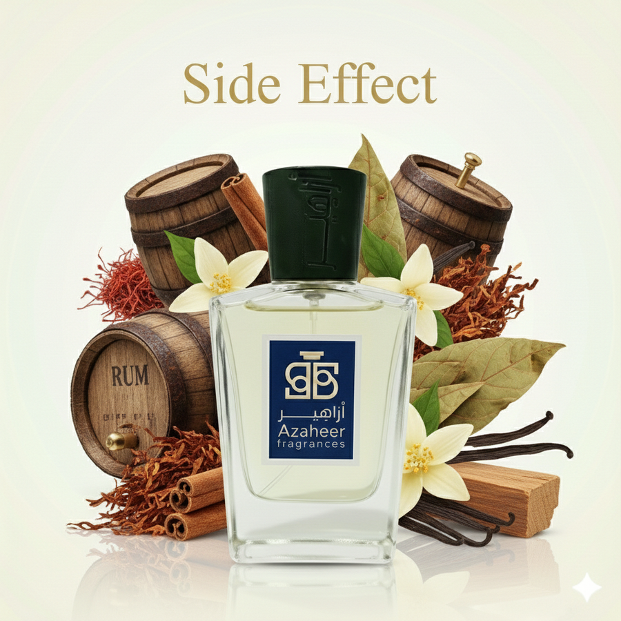 Side Effect at Azaheer Fragrances: rum and saffron with cinnamon and tobacco, lifted by hedione—finished with smooth vanilla and sandalwood.