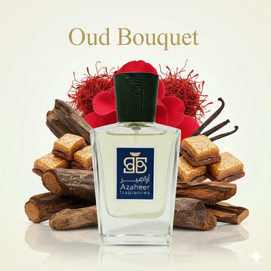 Oud Bouquet at Azaheer Fragrances: saffron opening, a rose-oud heart, and a creamy vanilla-praline dry down—luxury, warm, addictive.