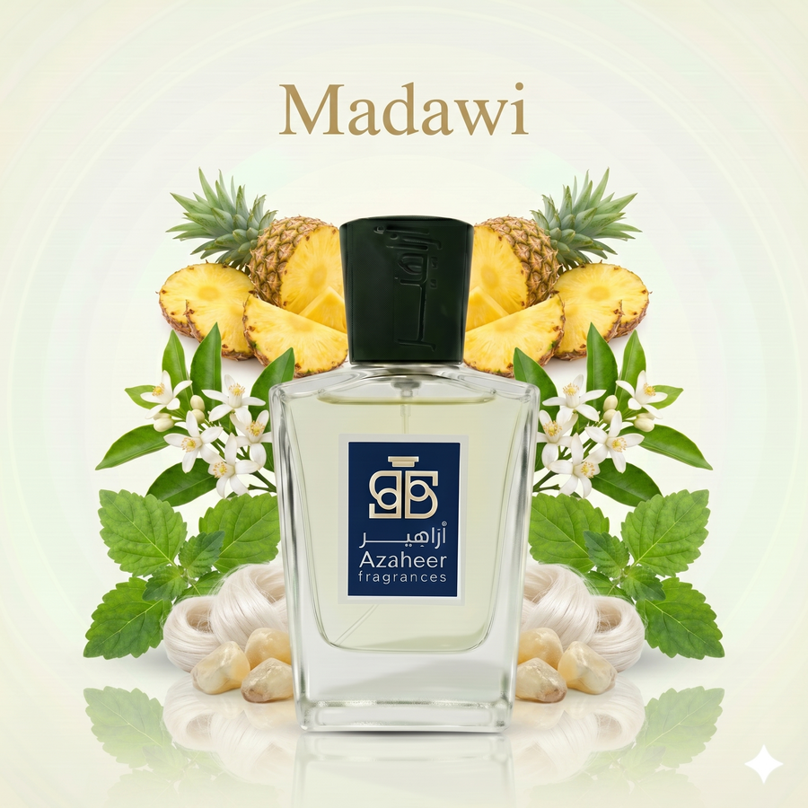 Madawi at Azaheer Fragrances: tropical pineapple and orange blossom over a soft patchouli-musk base with warm amber elegance.