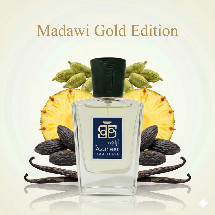 Madawi Gold Edition at Azaheer Fragrances: cardamom, pineapple and tonka bean over a warm vanilla base with rich gourmand oriental elegance.