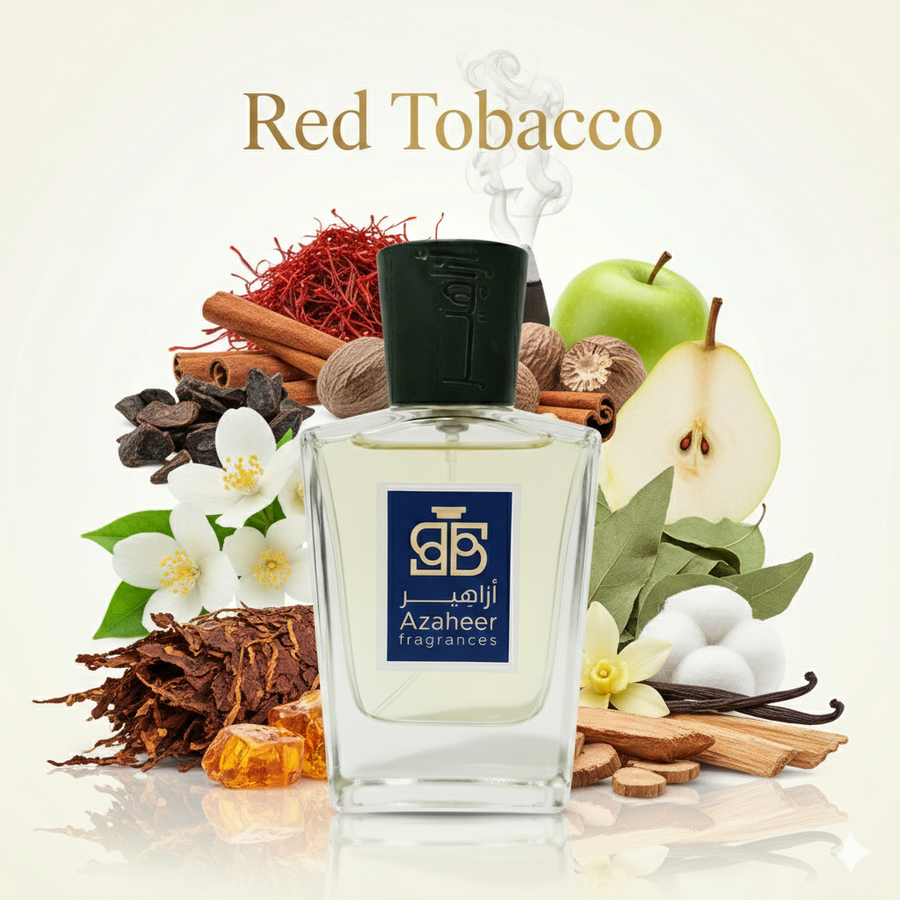 Red Tobacco at Azaheer Fragrances: cinnamon, saffron & incense over patchouli and jasmine—finished with tobacco, vanilla, amber, woods, musk and vetiver.