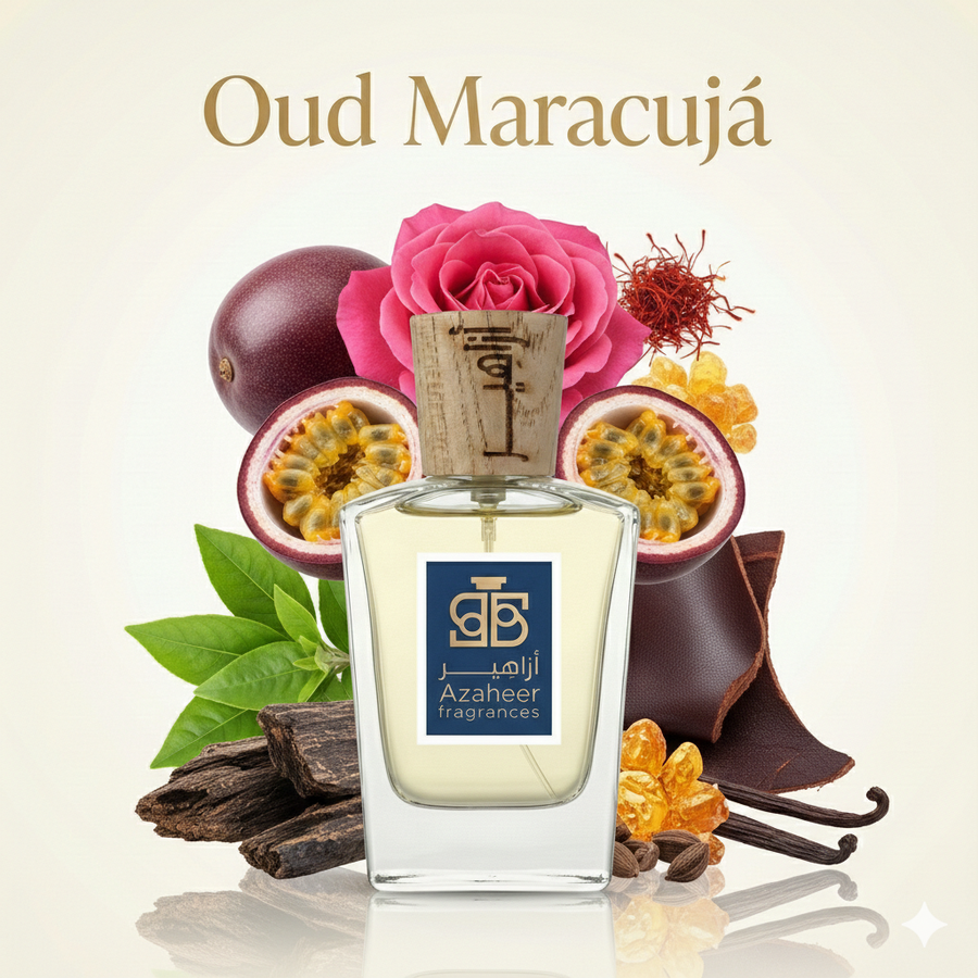 Oud Maracujá at Azaheer Fragrances: tart passionfruit, rose & saffron over deep oud, benzoin and patchouli—finished with leather, amber and vanilla.