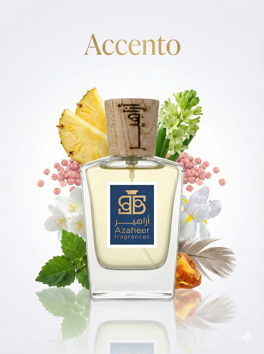 Accento by Xerjoff, a luxury fruity woody perfume blending juicy pineapple, soft florals, and a refined musky base β Azaheer Fragrances.