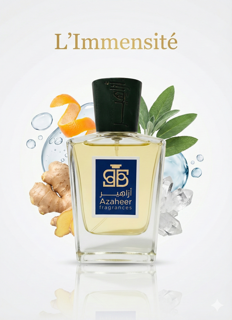 L’Immensité by Louis Vuitton, a luxury fresh spicy perfume blending citrus brightness, aromatic herbs, and a smooth amber base – Azaheer Fragrances.